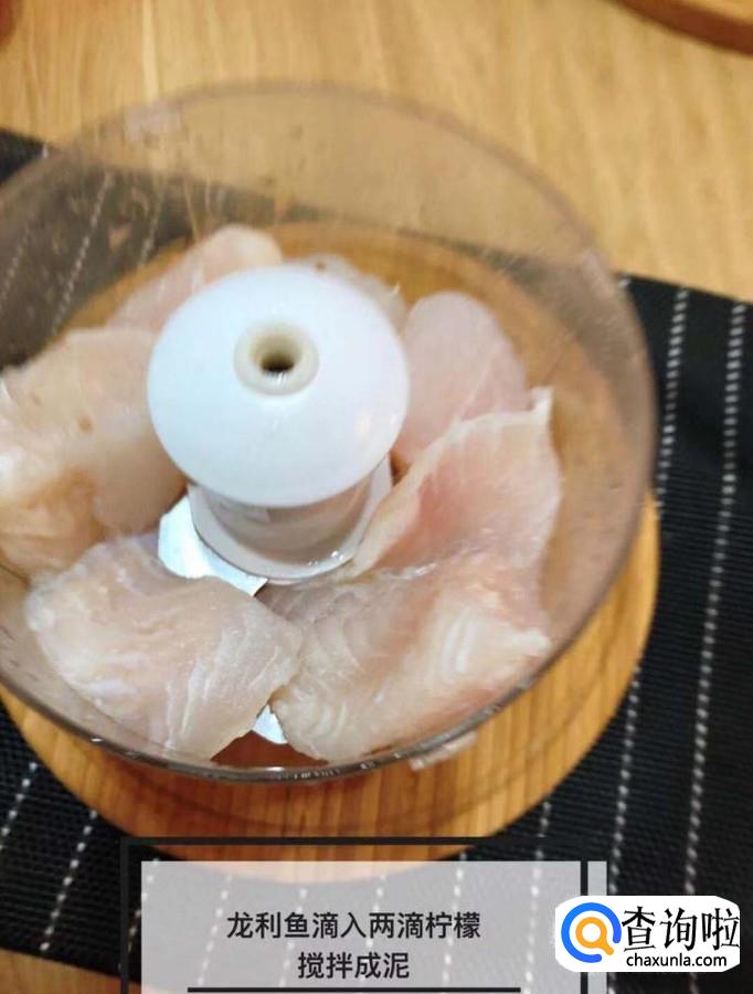 然后将龙利鱼倒入料理机中并加入两滴的柠檬汁,如下图所示。