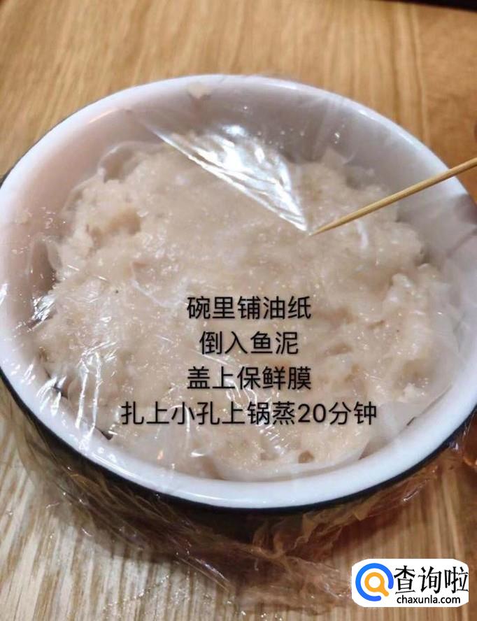 接着将搅拌好的鱼泥装入一个碗中,盖上保鲜膜,扎上小孔上锅蒸20分钟,如下图所示。
