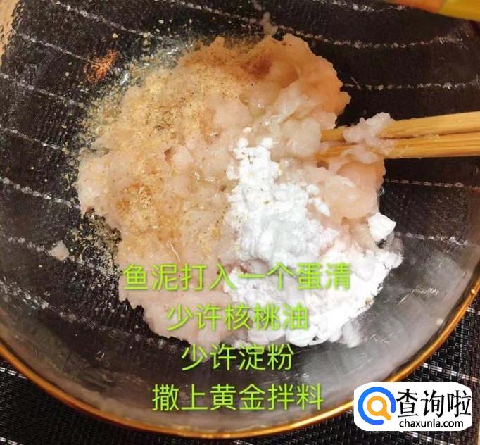 然后在鱼泥打入一颗鸡蛋、加入核桃油、少许的淀粉和黄金拌料,搅拌均匀,如下图所示。