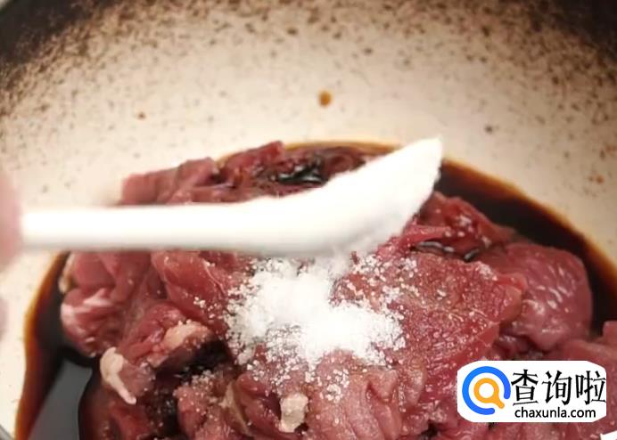 牛肉加生抽,老抽,白糖,盐巴,生粉和少许食用油拌匀。