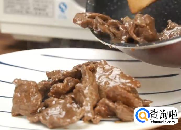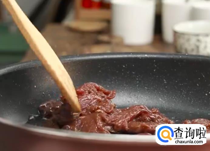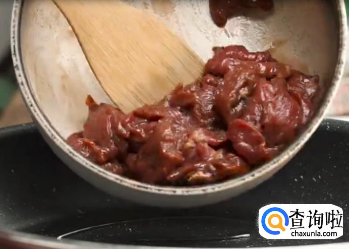 下油热锅,将牛肉倒进锅内炒至八成熟,盛出备用。