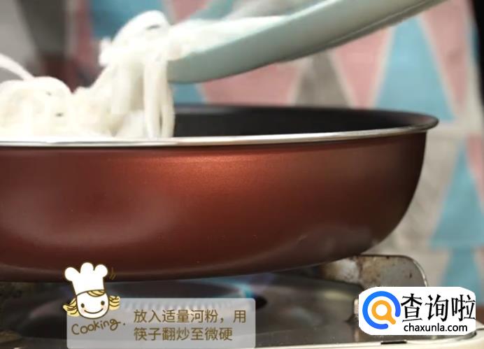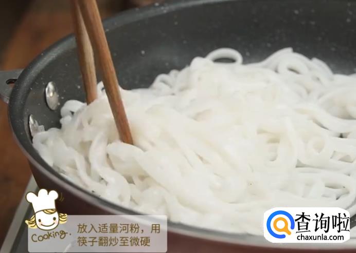 再次下油热锅,放入河粉,用筷子翻炒至微微发硬。