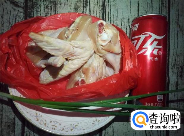 准备好所有材料:鸡翅4个、可乐一支、香葱一根。