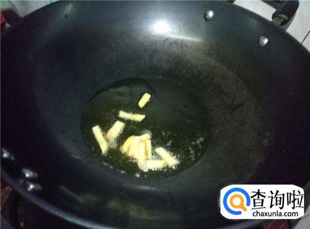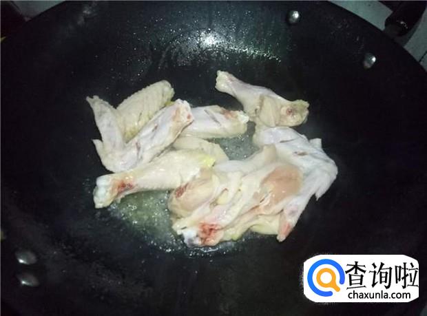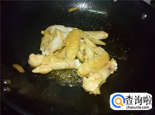 热锅下油,放入姜片煸香,倒入鸡翅,快速翻炒。