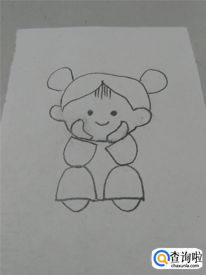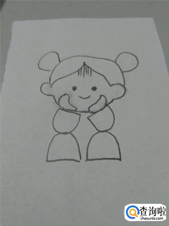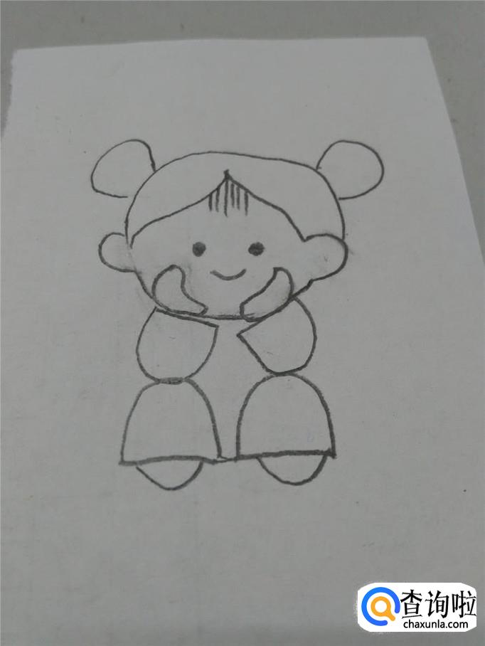 在两只袖子下面,各画一个大一些的半圆形,表示小腿,两只胳膊分别立在小腿上,表示女孩坐着,托着腮。