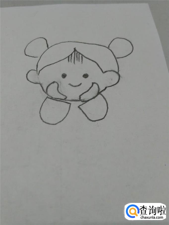 在嘴的下面,画两个豆子的形状,表示女孩的两只托着腮的手。