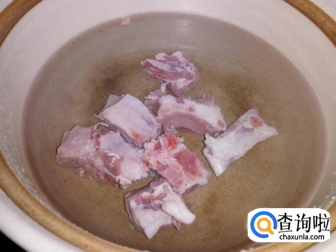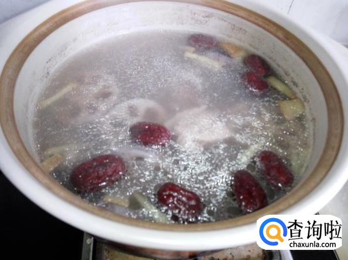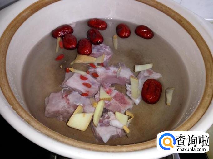 砂锅洗净,加入适量的水,放入排骨,然后加入生姜片适量、红枣8粒、几粒枸杞。说明:如果有桂圆,也可加入2-3粒。