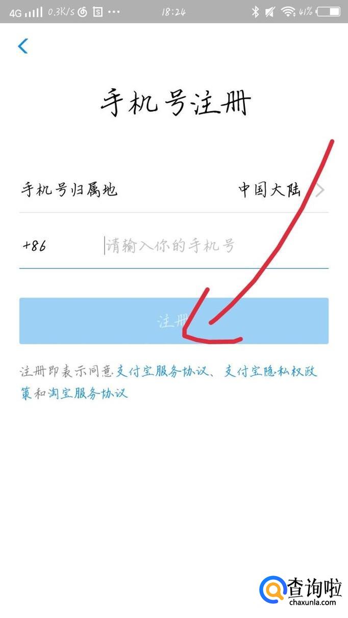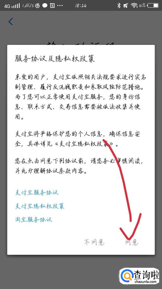 输入你手机收到的验证码,你会看到出现一个新的界面,点击“同意”选项,如图1箭头所示。这样你就可以注册支付宝账号了。如果你有很多号码,可以注册很多的支付宝账号。