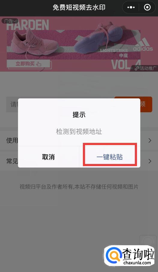 打开后,系统会弹出一个窗口,说检测到视频地址,这时我们点击“一键粘贴”即可。如果未弹出这个窗口,我们在视频地址输入框中,手动输入我们之前复制下来的视频链接即可。