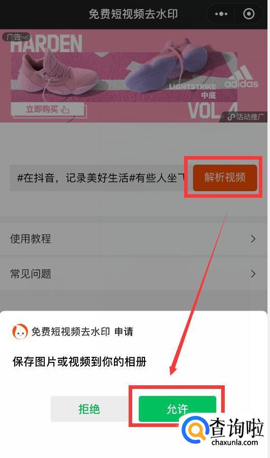 输入后点击“解析视频”,弹窗中点击“允许”。