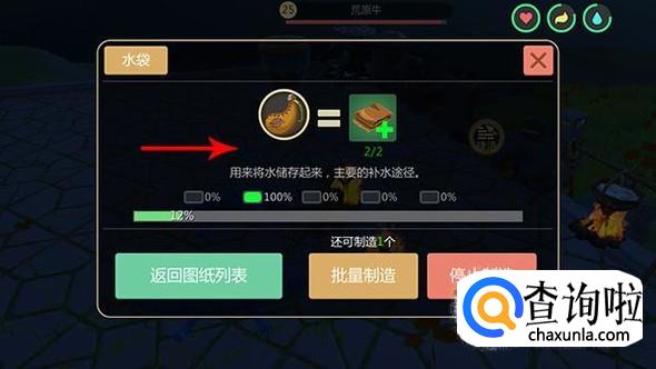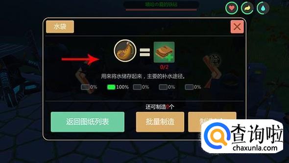 我们先来看一下制作水袋需要些什么材料,在图纸列表中点击查看,制作水袋需要2个皮革。