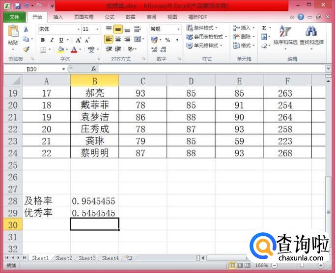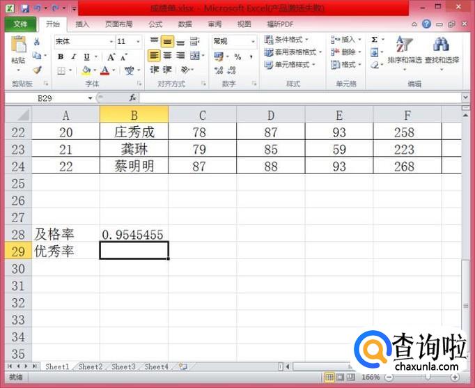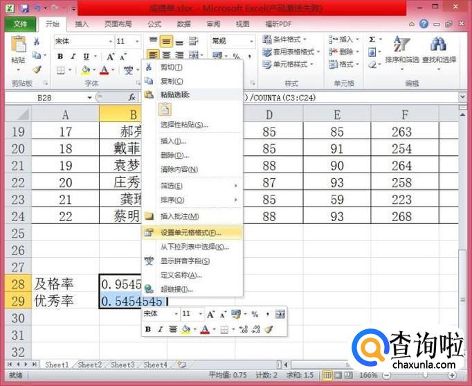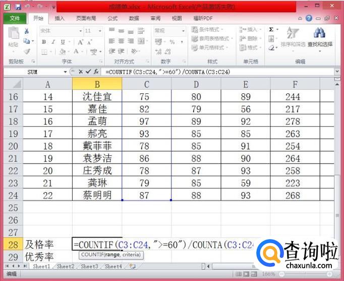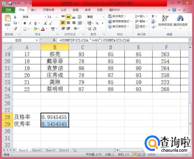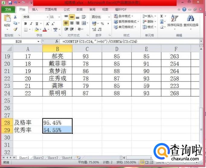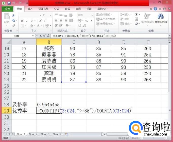 在在优秀率旁的空白单元格输入“=COUNTIF(C3:C24,">=85")/COUNTA(C3:C24)”