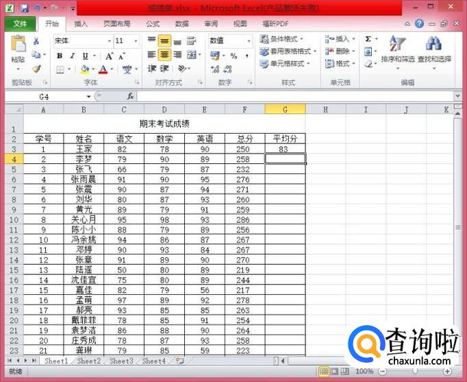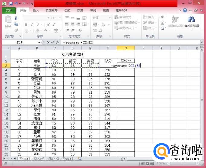 在G3单元格内输入”=AVERAGE(C3:E3)"