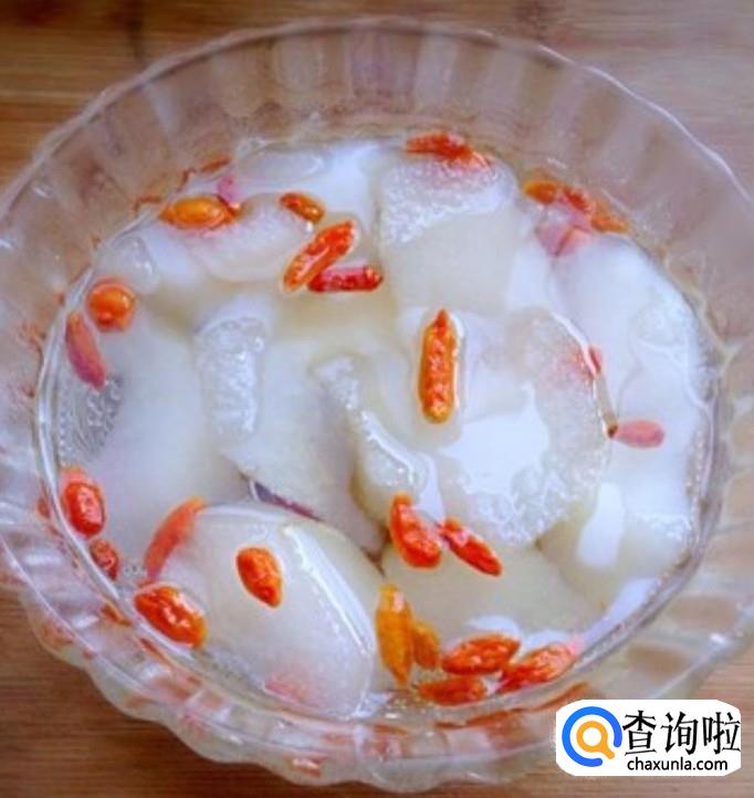 雪梨炖枸杞,锅中加水加入冰糖等汤融化以后,加入雪梨枸杞,炖20分钟滋阴养肺而且做法很简单,口感也很好。