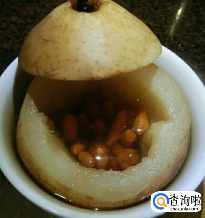 雪梨炖雪蛤,雪蛤油发开备用,雪梨如图去核,在雪梨中加入雪蛤、枸杞、冰糖然后上锅蒸20分钟。滋补养颜效果很好。