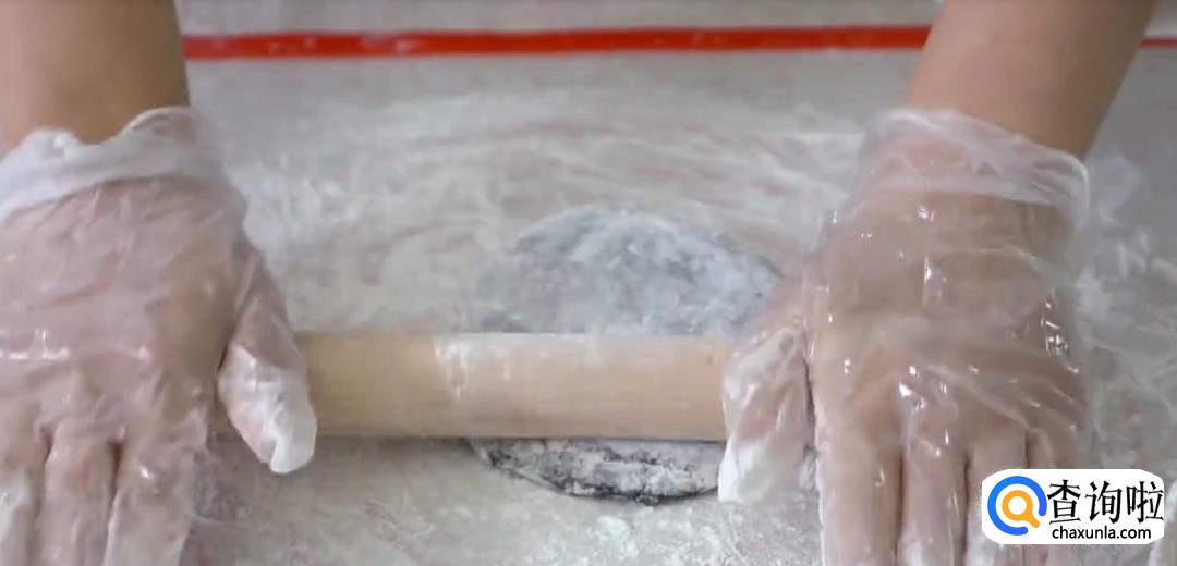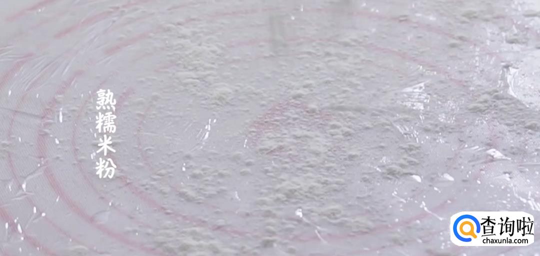 在操作台上撒上熟糯米粉,将蒸好的雪媚娘糊倒出来沾上糯米粉,擀成面皮状。