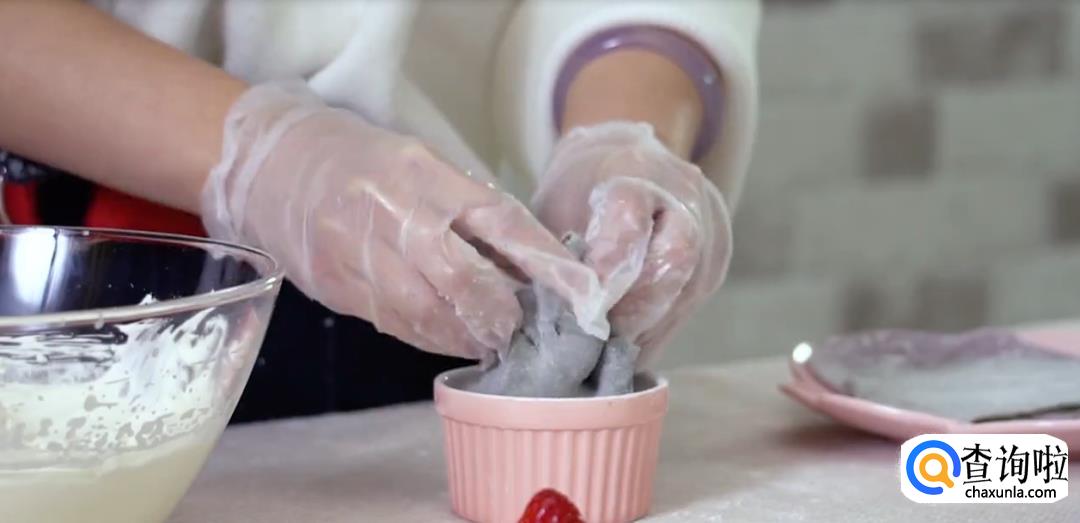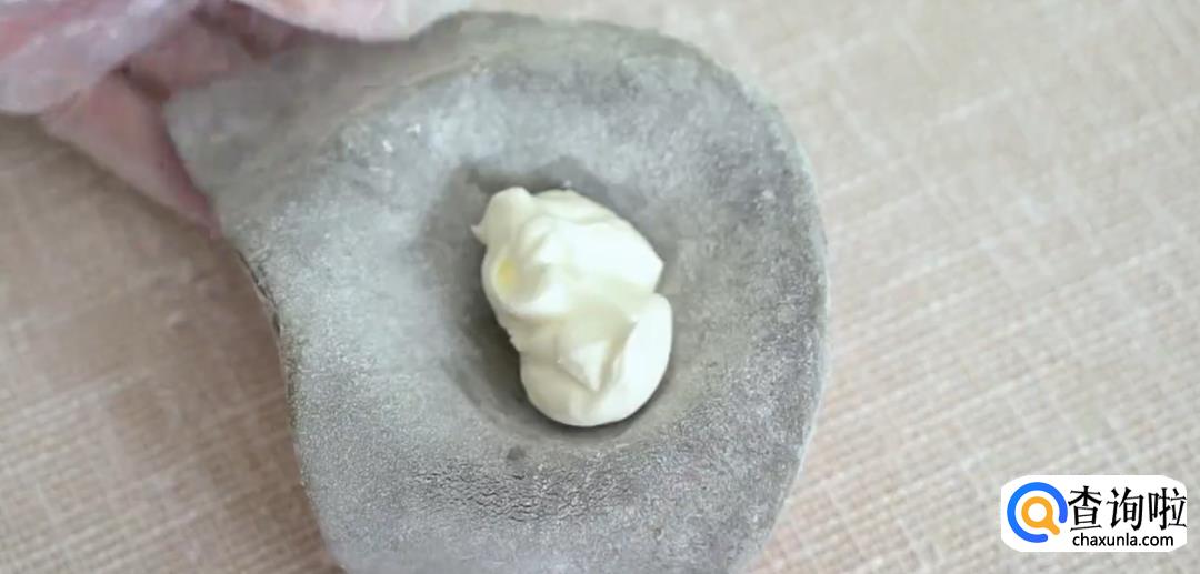 再次装入一勺奶油,放入磨具中将面皮口收拢,捏成雪团子。