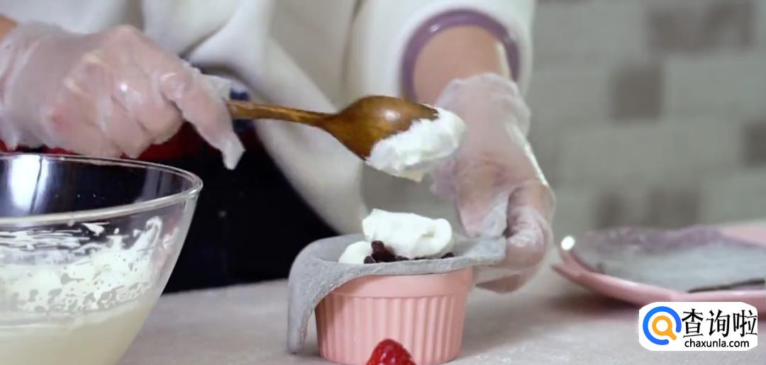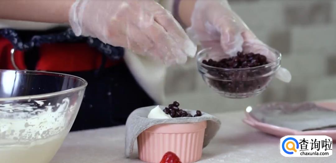 将面皮摊开,里面包裹一勺奶油,再装入甜蜜豆。