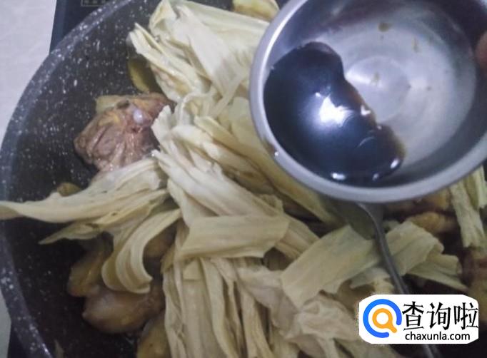 土鸡肉400克,腐竹70克,姜片、蒜米适量,生抽1勺,料酒1勺,老抽小半勺。
