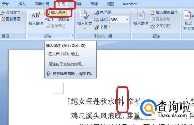 光标移到该处位置,在上方菜单中点击“引用”,然后选择“插入尾注”。