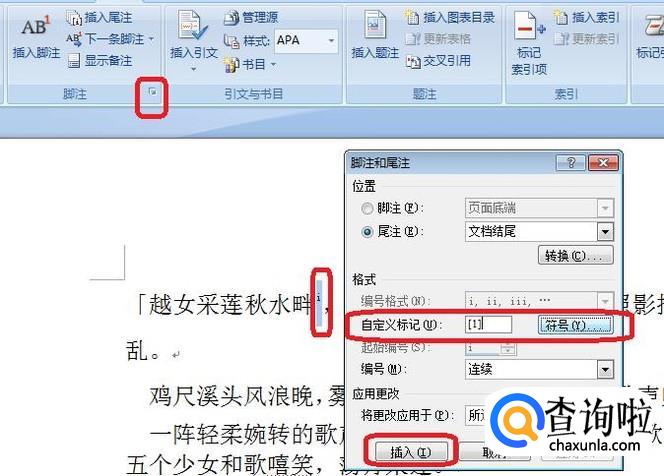 如图所示,选中标注符号后,点击脚注旁边的小箭头,弹出“脚注和尾注”对话框,通过“符号”按钮选择,把自定义标记改成中括号的格式,点击“插入”。