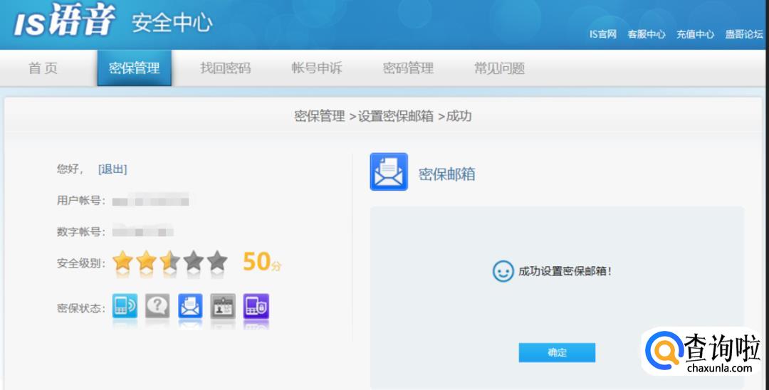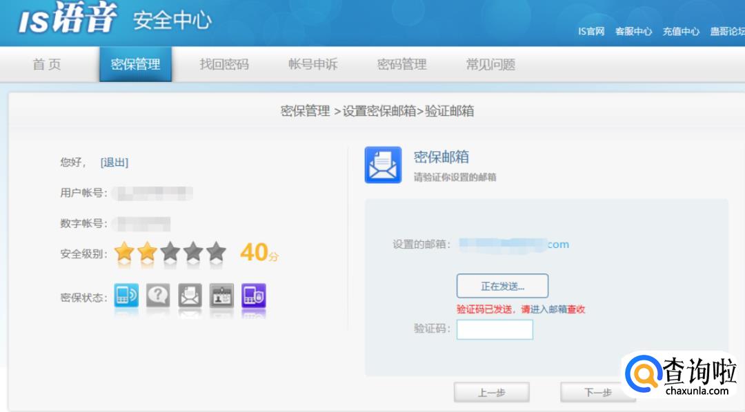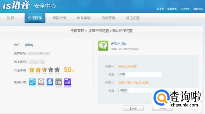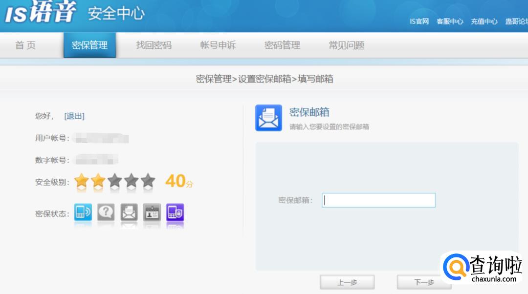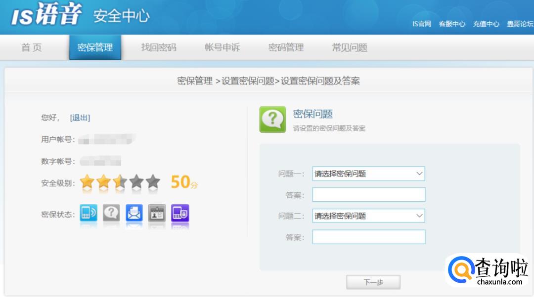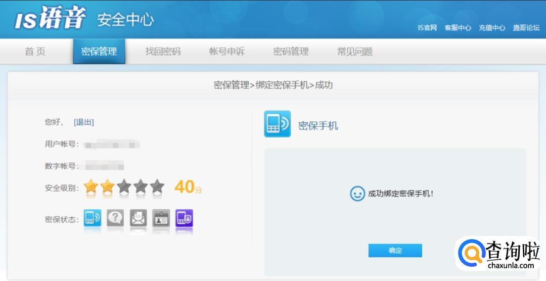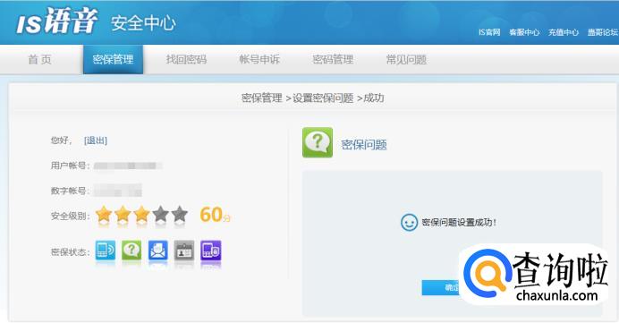 绑定结束后安全级别增加到40分,然后是设置密保问题,这里根据个人的喜好选择设置::