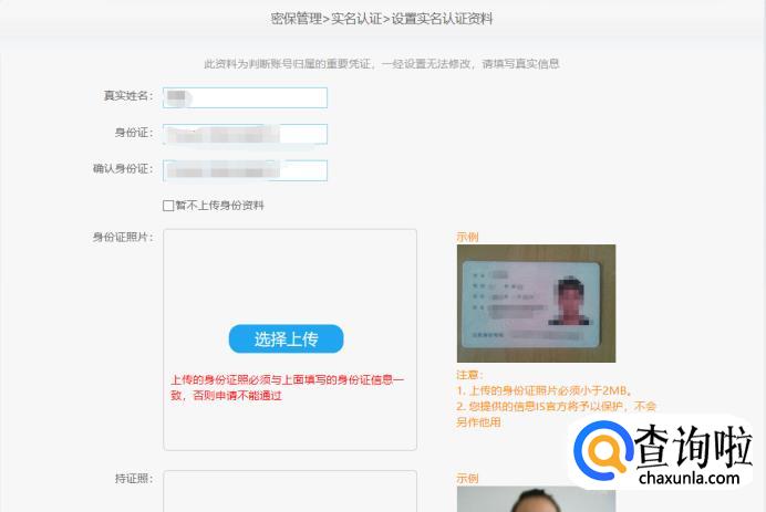 设置完密保问题后,安全等级就涨到了60分了,然后进行实名认证,填写自己的真实信息,再上传两张身份证证件照,也可以选择暂时不上传证件照,不上传证件照的话安全等级就只有80分: