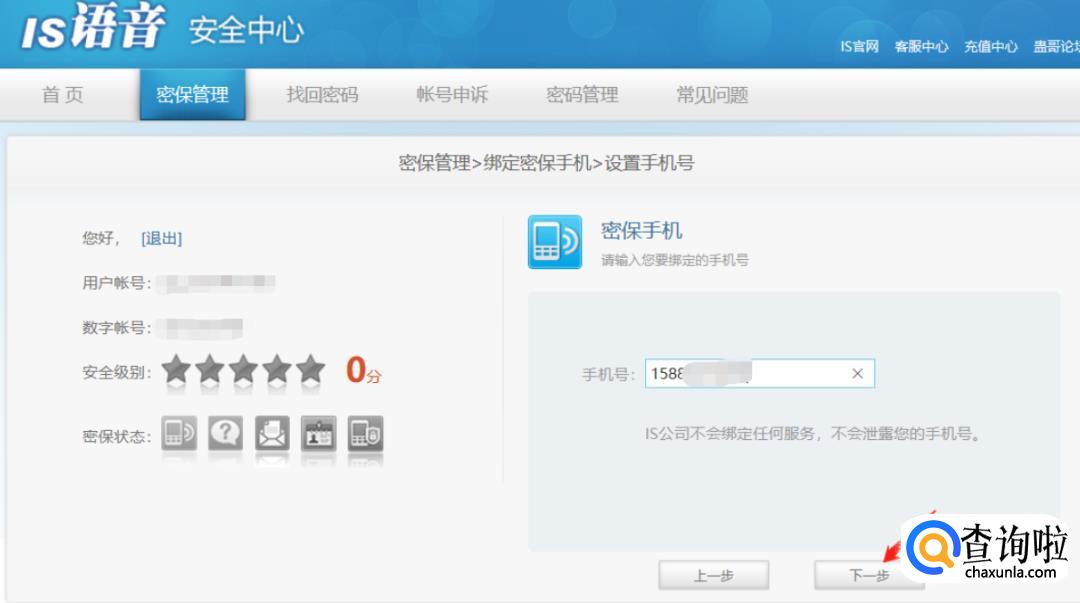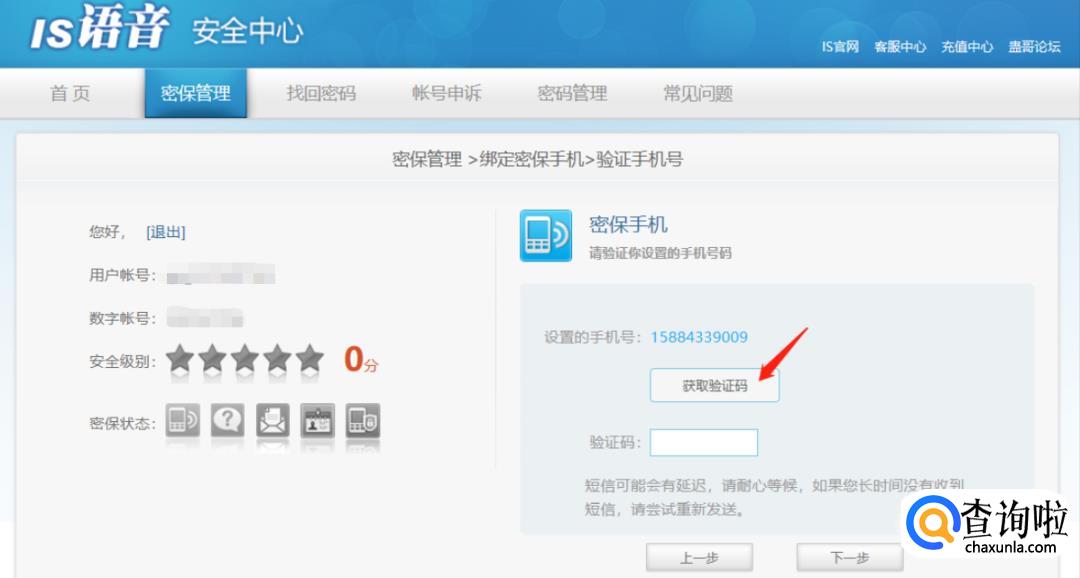 点击密保手机,绑定自己已有的手机号,需要接收短信验证码: