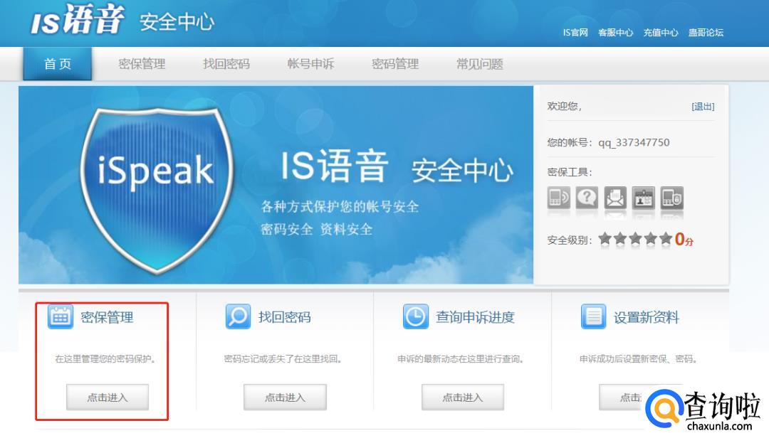 点击红框中密保管理下方的【点击进入】:
