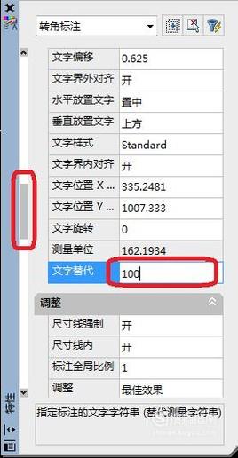 弹出“特性”编辑框,如图所示,往下拉动左侧滑块,在文字选项下看到“文字替代”,我们在其中输入“100”即可。