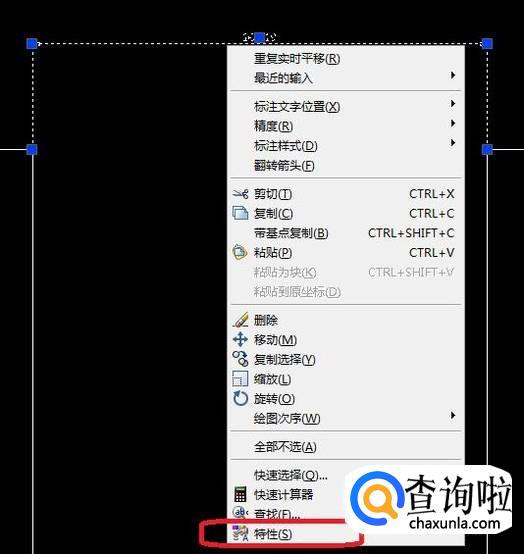比如说,我要把标注数字改成“100”,鼠标点击选中整个标注,右键点击,选择“特性”。