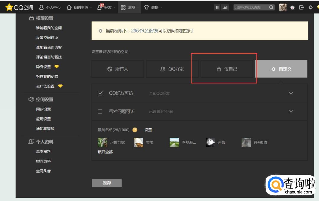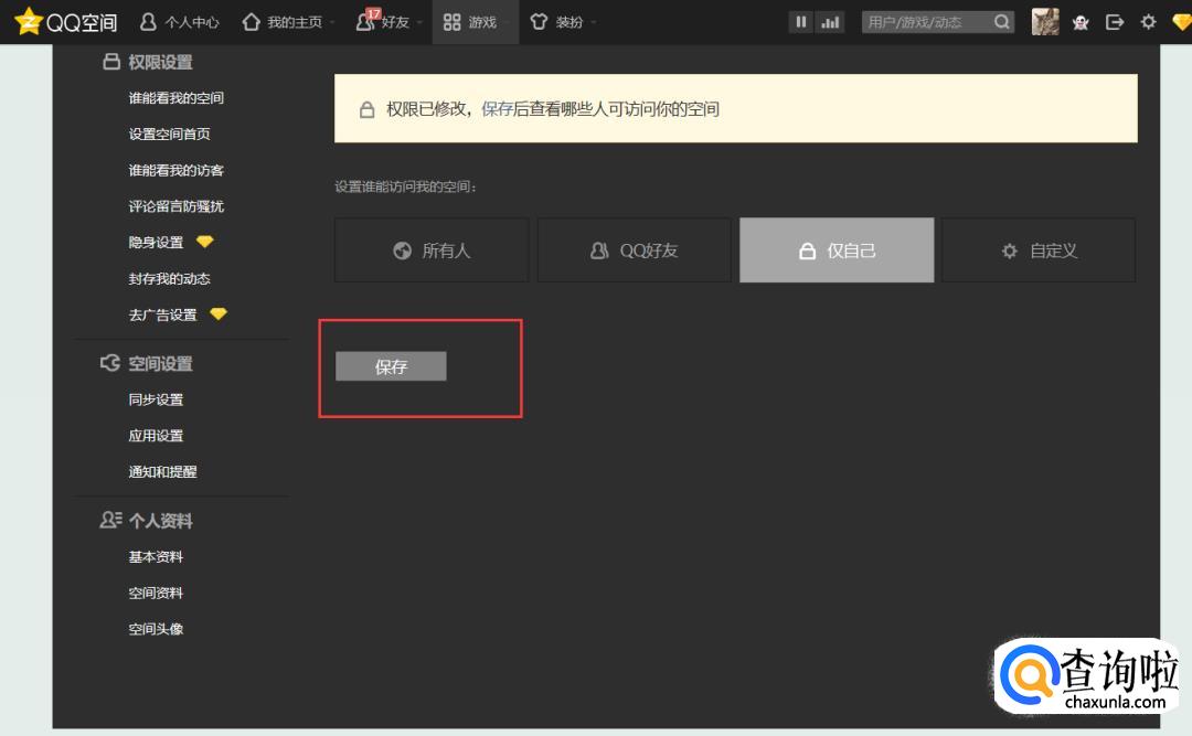 然后会进入权限设置页面,点击【仅自己】,然后点【保存】即可: