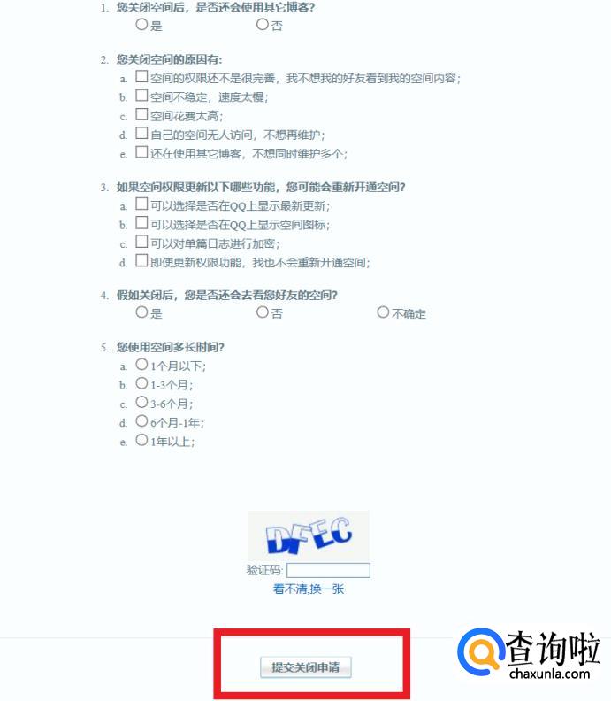 点击后进入一个问卷调查页面,每一个选项请根据自己实际情况勾选,勾选完之后,输入验证码并点击【提交关闭申请】即可: