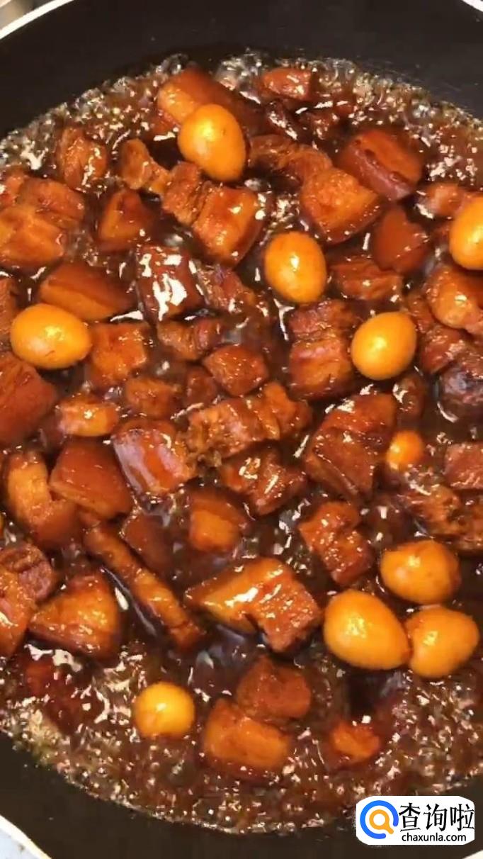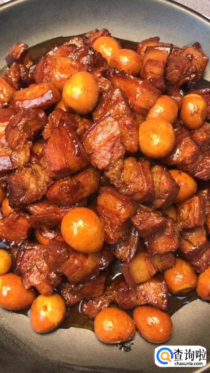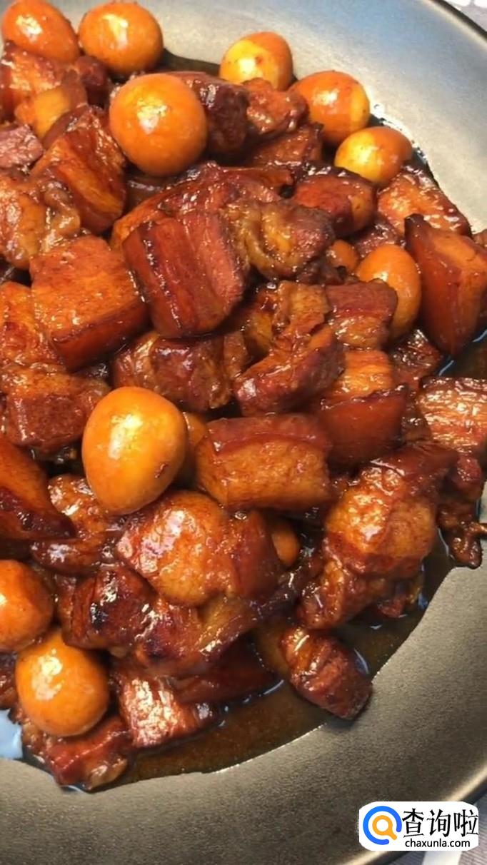 五花肉,料酒,白糖,桂皮,八角,香叶,大蒜,酱油,清水,鹌鹑蛋。