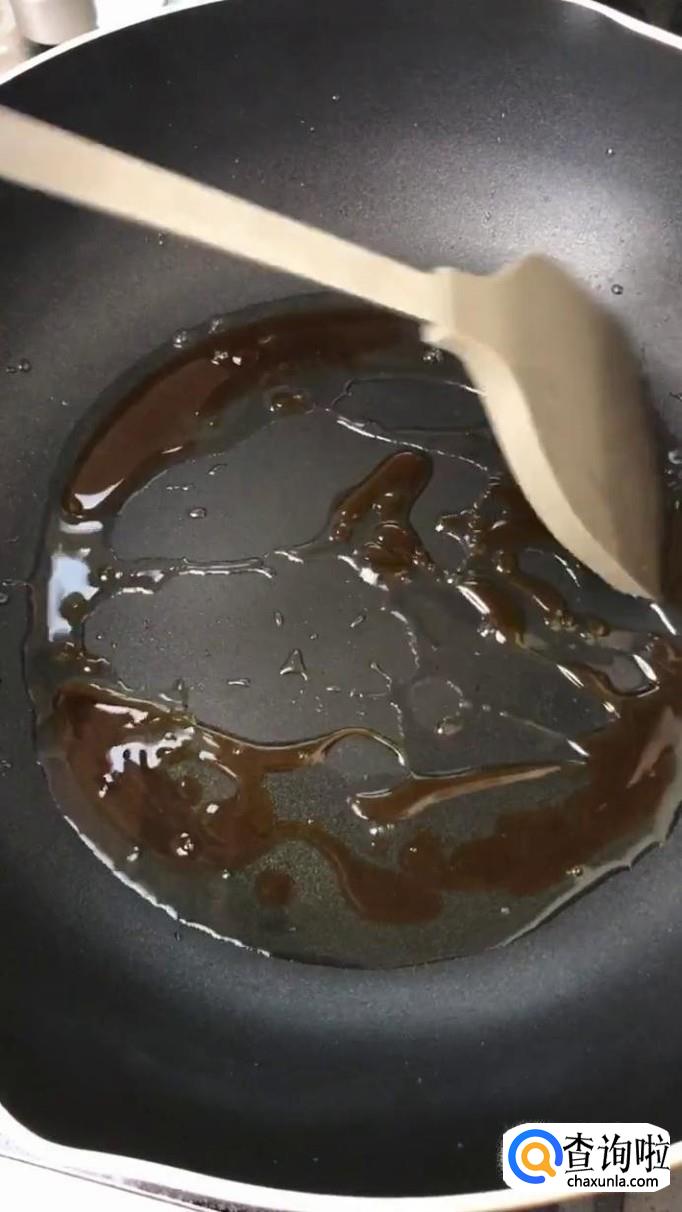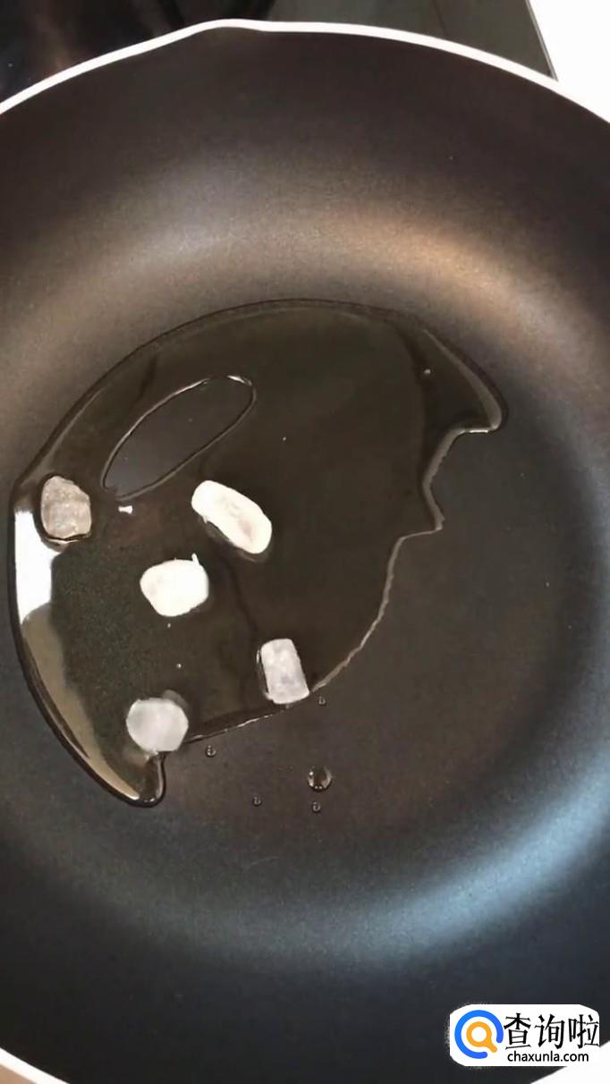 接着往锅中加入适量的食用油,待油冒烟,倒入几块冰糖,搅拌融化,如下图所示。