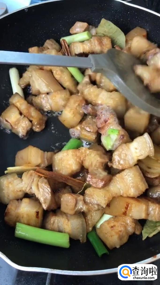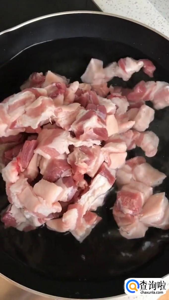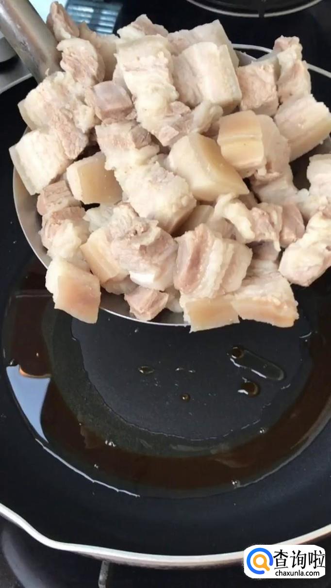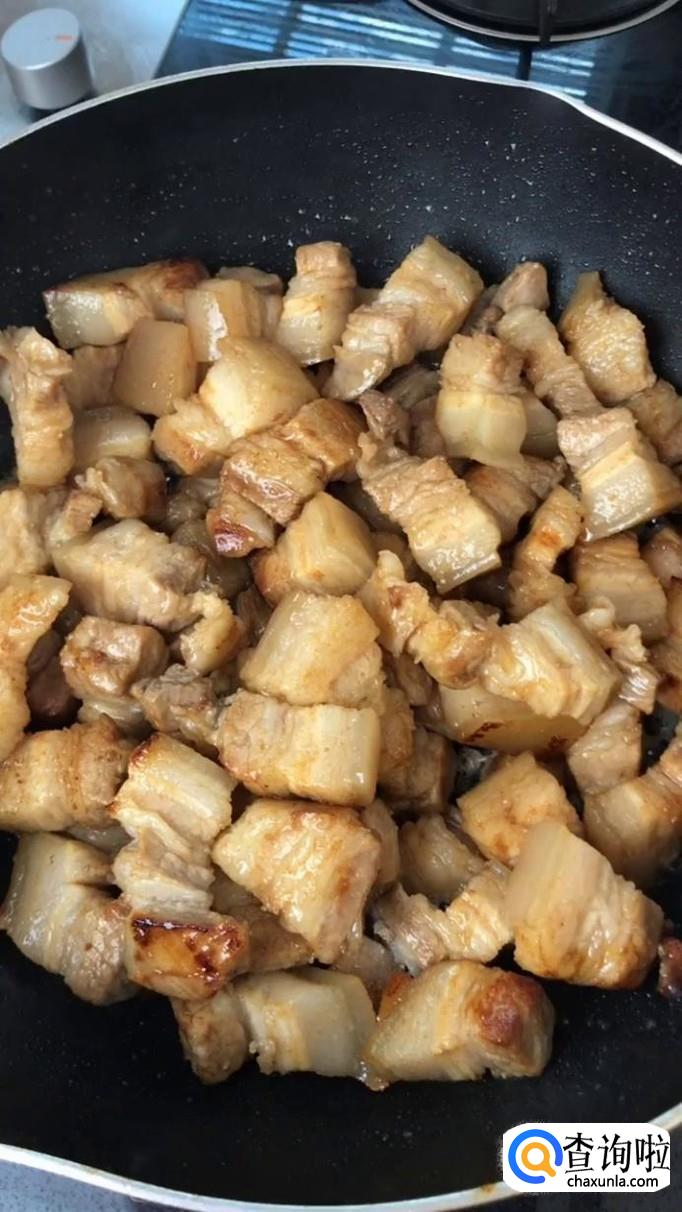 然后把烫好的五花肉倒入锅中翻炒三分钟,如下图所示。