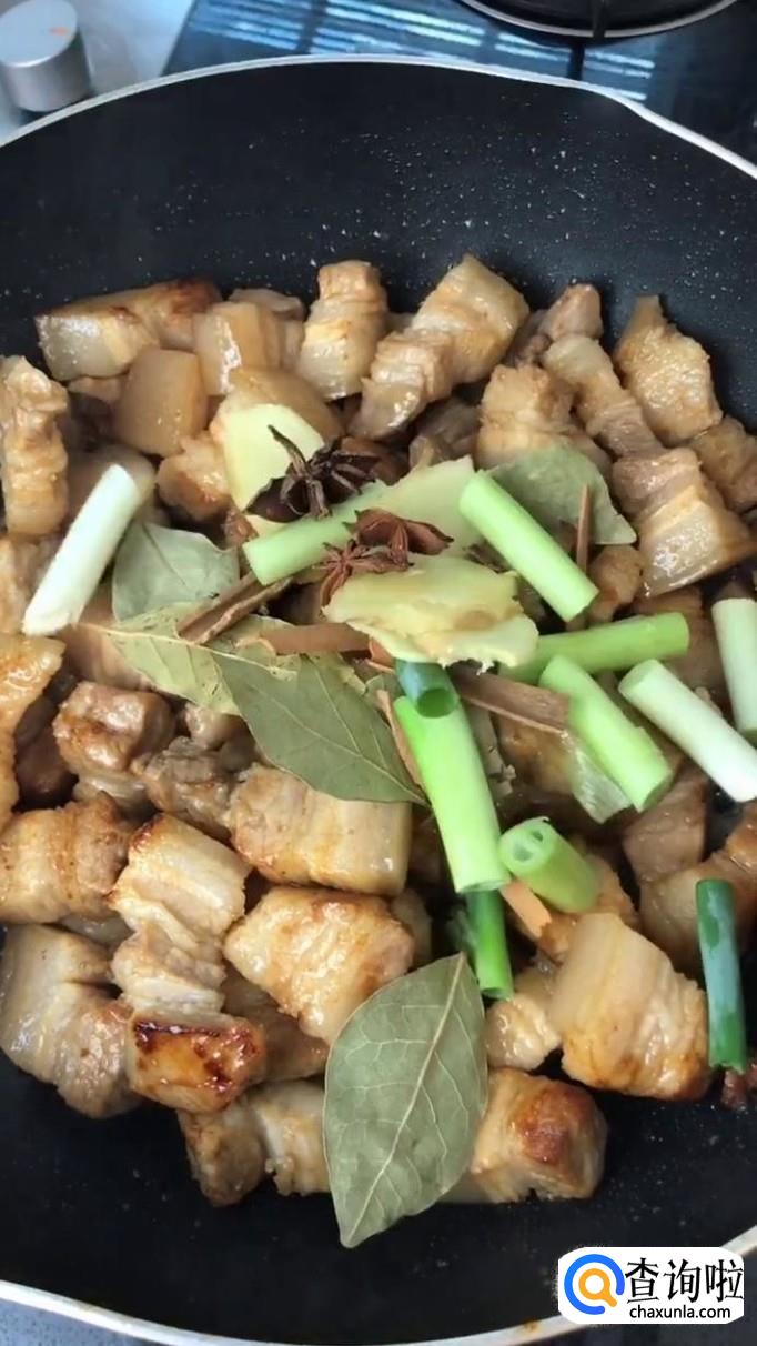 接着往锅中加入桂皮,八角,香叶,蒜头,生姜和大蒜段,翻炒三分钟,如下图所示。