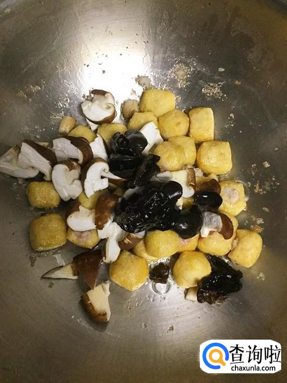 泡发的黑木耳和切成小块的鲜香菇一起放入锅中。