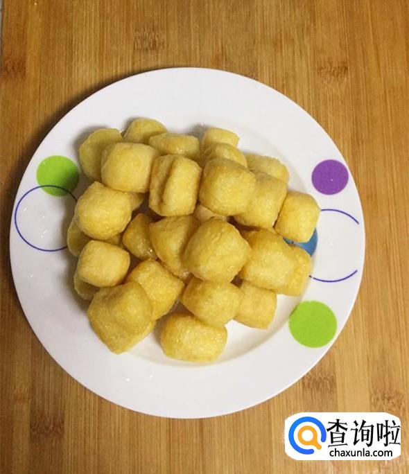 油豆腐用温水冲洗后沥干水分放入盘中待用。