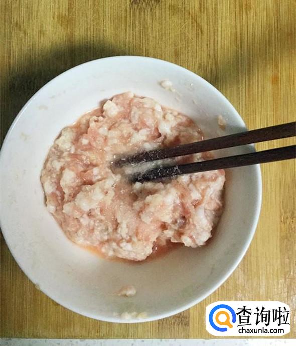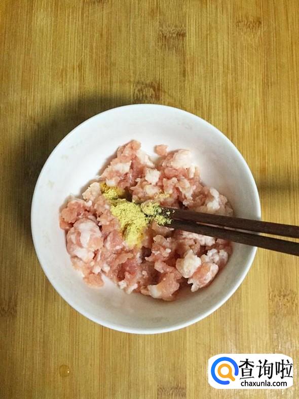 肉糜放入碗中,依次加入1小勺料酒和生姜粉,搅拌均匀。
