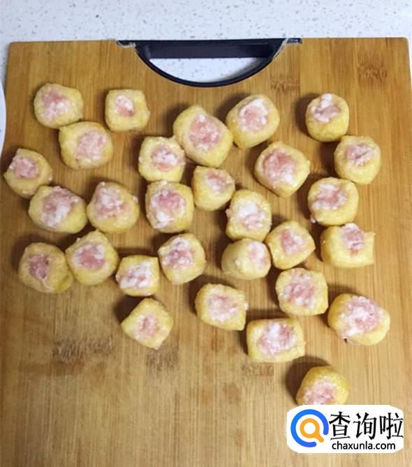 油豆腐用手指弄开一个小口子,把调好味的肉糜塞入其中。