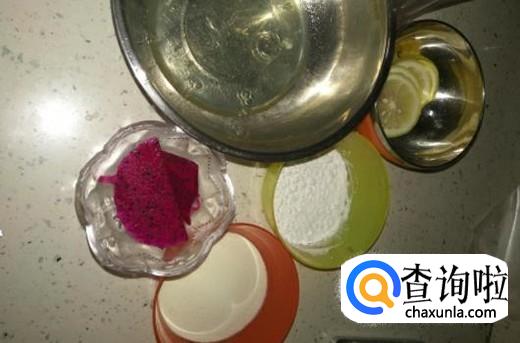 蛋清:3个,85克左右。奶粉:35克。淀粉:25克。火龙果:90克。柠檬片:4片。
