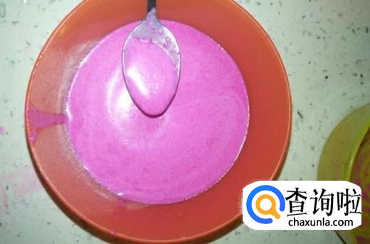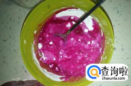 把火龙果打成泥,然后用小火翻炒一下,炒的稍微粘稠一些,接着拿出来和奶粉、淀粉混合搅拌在一起。