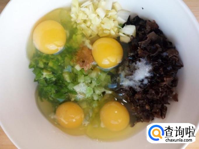 把切好的木耳,芹菜,青椒,葱,姜,一起放入碗中,放入盐,味精,五香粉。
