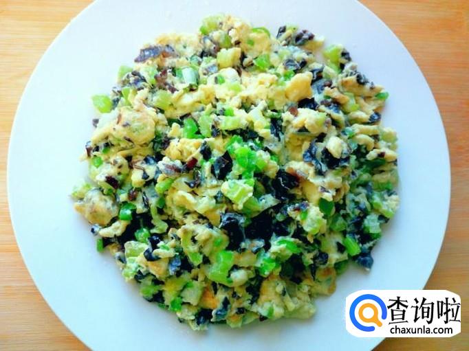 芹菜 150克,木耳 适量,青椒 1个(小),鸡蛋 4个。
