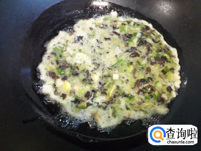锅里放入油加热,油热后放入鸡蛋液小火煎塌。