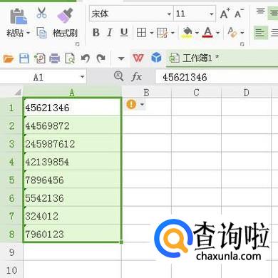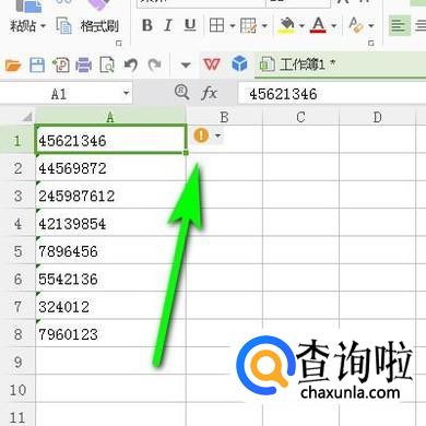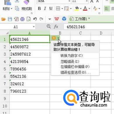 鼠标点击一下A1单元格,在单元格右侧即显示出一个桔色感叹号和一个小三角按钮。鼠标点击按钮。弹出下拉菜单。