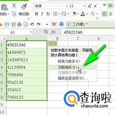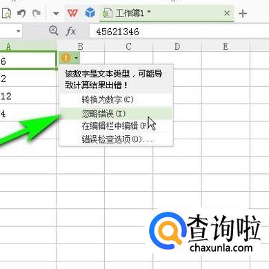 可以看到选中的这些数据中,在右上角显示一个桔色感叹号和一个小三角按钮。鼠标点击按钮。弹出下拉菜单。再点击:忽略错误。