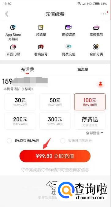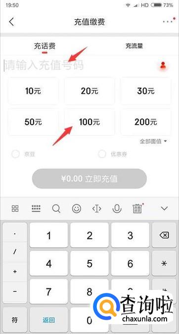 接着我们只需要输入想要充值的手机号码,选择好需要充值的金额。