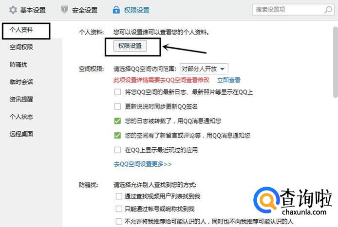 在个人资料中点击权限设置;
